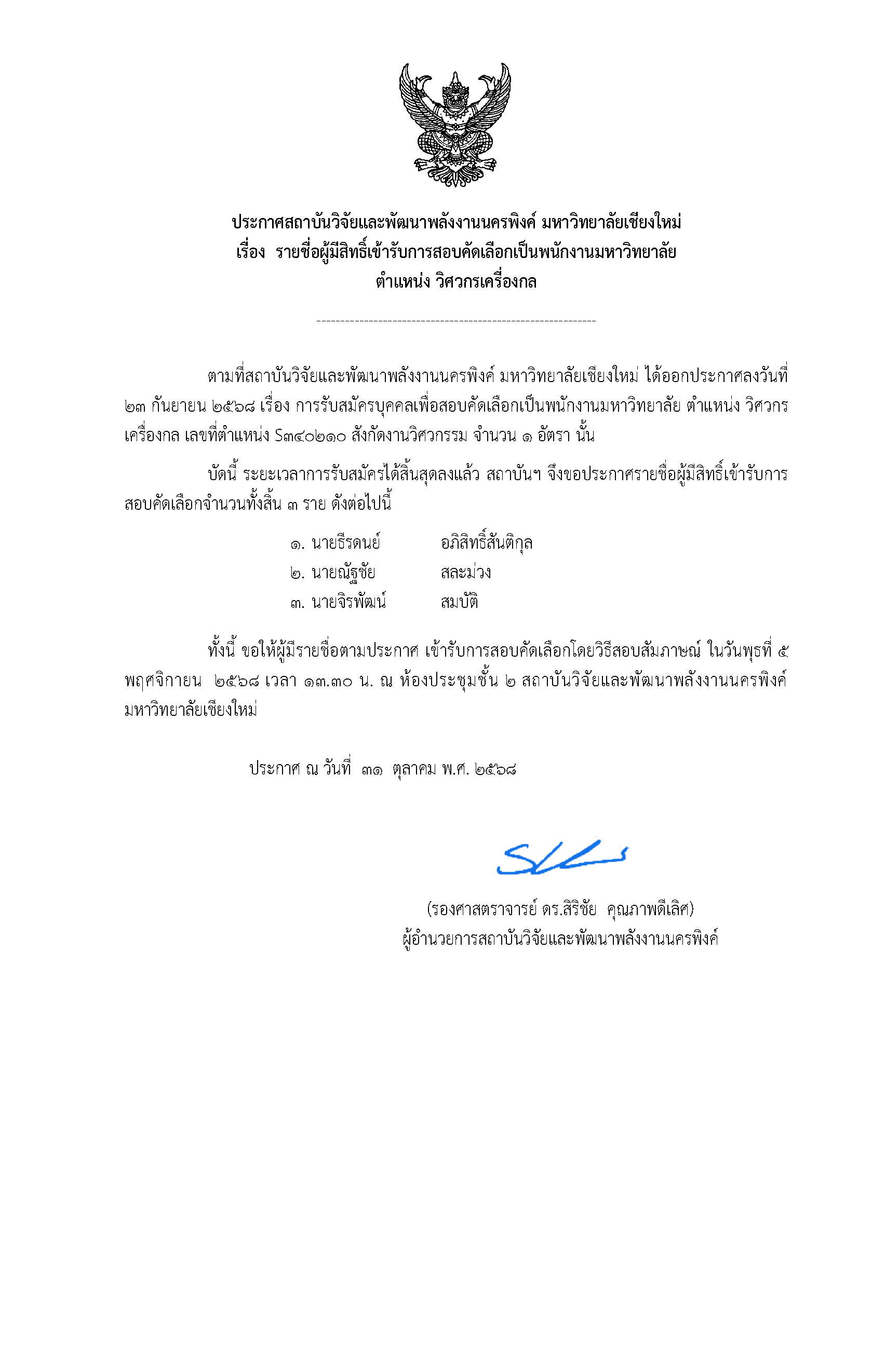 ประกาศรายชื่อผู้มีสิทธิ์เข้ารับการสอบคัดเลือกเป็นพนักงานมหาวิทยาลัย ตำแหน่ง วิศวกรเครื่องกล