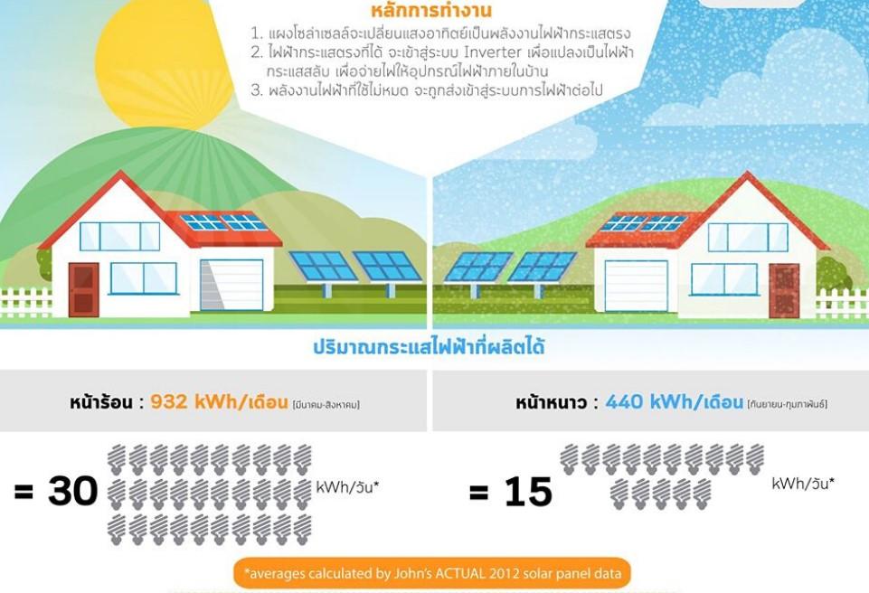 สรุปหลักการทำงานของระบบ ปริมาณที่ผลิตได้ในหน้าร้อน และหน้าหนาว แล้วไฟฟ้าที่ได้ 1 กิโลวัตต์ สามารถทำอะไรได้บ้าง Infographic นี้จะช่วยให้คุณเข้าใจมากขึ้นค่ะ Credite : averages calculated by John’s ACTUAL 2012 solar panel data